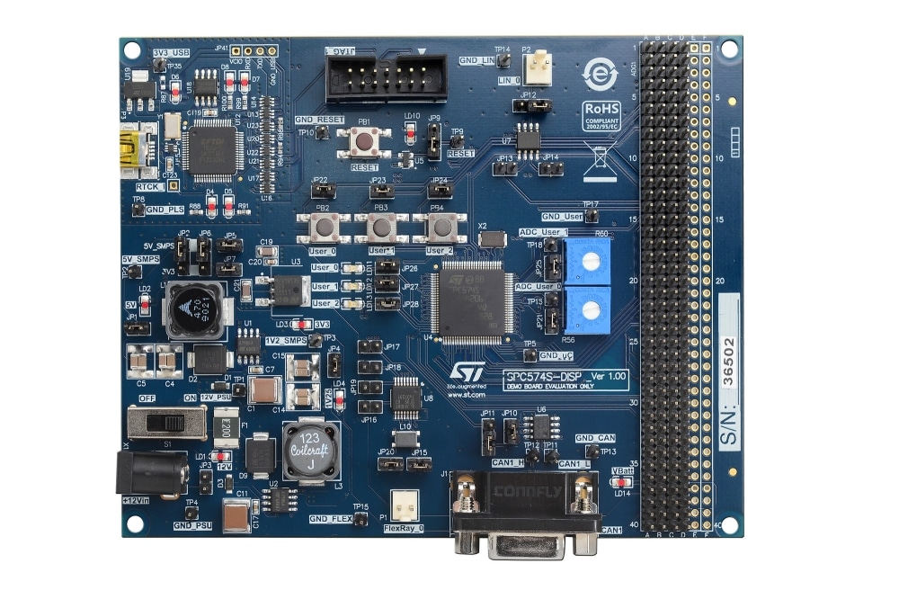 SPC57 4S Line is designed to meet the ASIL-D highest functional safety level, in compliance with ISO26262. The SPC574S-DISP provides full access to all CPU’s signals and GPIO’s, and exposes a wide set of connectivity options, such as CAN-FD, FlexRay, LIN, UART.