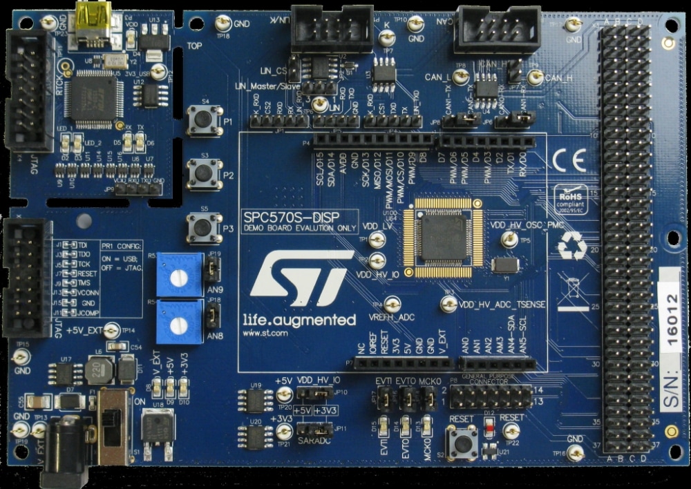 The SPC57S-Discovery board helps you to discover SPC57 S Line Power Architecture® Microcontrollers with full access to CPUs, I/O signals and peripherals such as CAN, UART, JTAG, K-Line, LIN at budget price. Free ready-to-run application firmware examples are available inside SPC5Studio to support quick evaluation and development. SPC5Studio includes visual configurable code generation engine, board support package (BSP), startup routines, interrupt services, free RTOS (optional) and a full set of low level drivers. SPC5Studio includes a free GCC compiler. SPC5Studio is available for free download. The SPC57 S Line is designed to address all Automotive Applications but as well industrial safety oriented applications.The SPC570S devices feature specific functions to make automotive applications with integrity level up to ASIL-D of ISO 26262. An E2E Community is available on ST WEB.