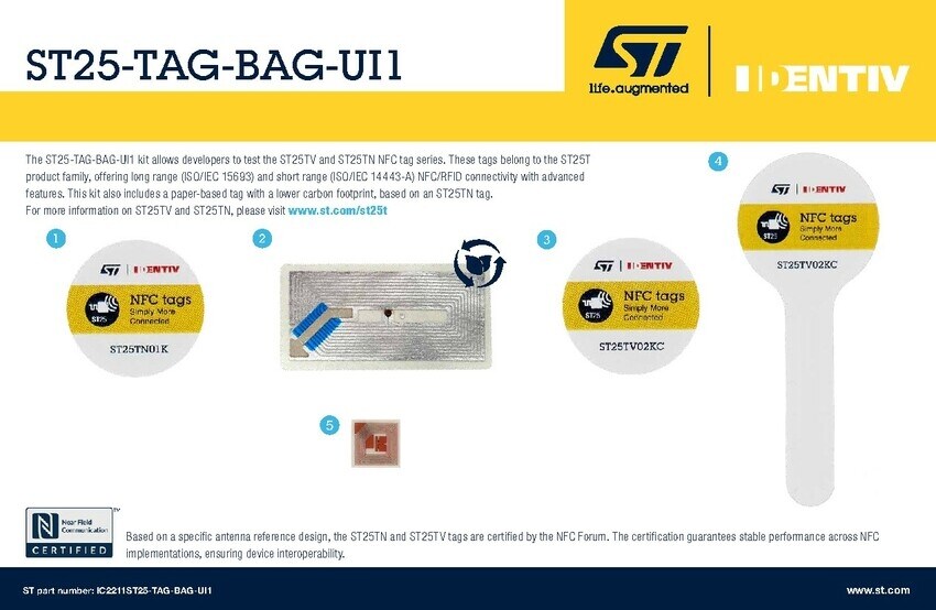ST25-TAG-BAG-UI1是即用型标签集,包含基于NFC Forum Type 5 (ST25TV02KC) 标签IC和NFC Forum Type 2 (ST25TN01K) 标签IC的标签。这类IC可与不同尺寸和材料的天线相结合,运用先进的设计(如篡改检测)来满足不同的应用需求。