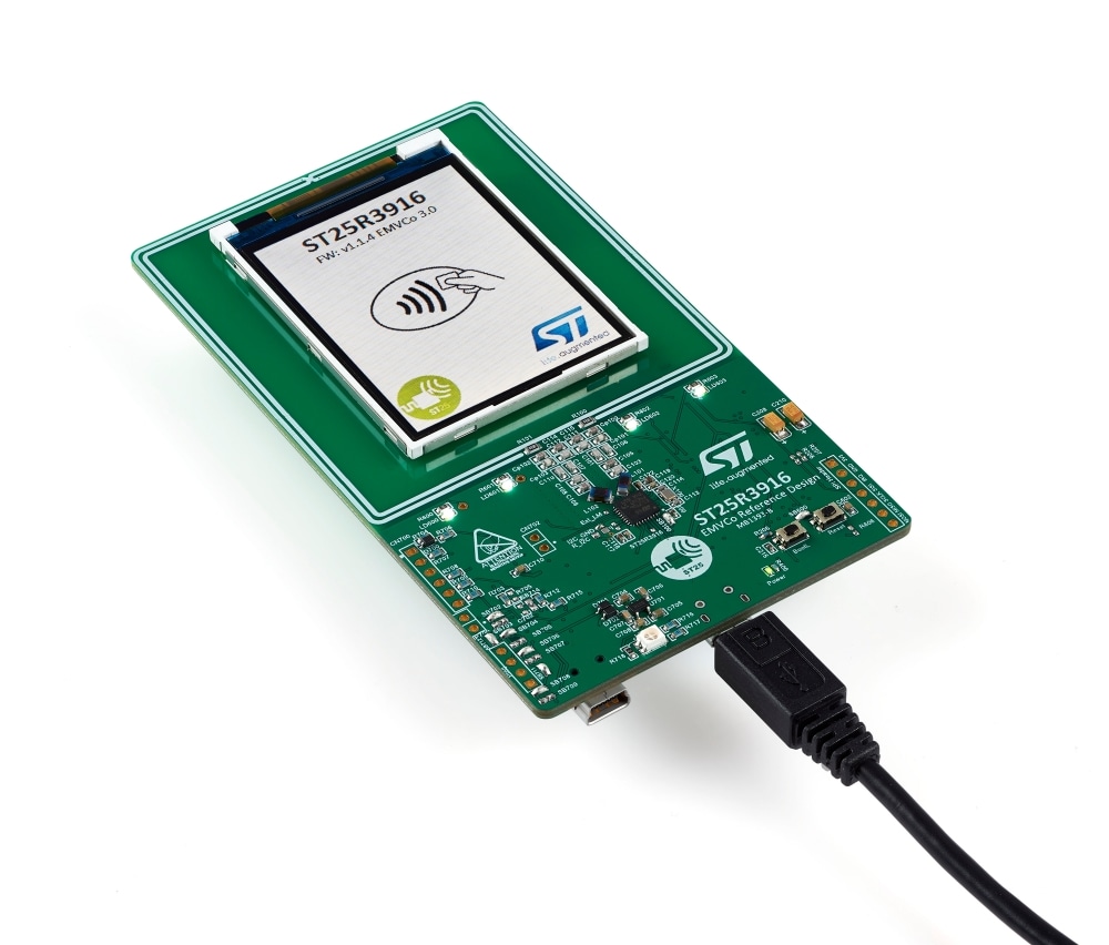 - Based on the ST25R3916 high performance NFC universal device and EMVCo reader in QFN32, 5 mm x 5 mm package