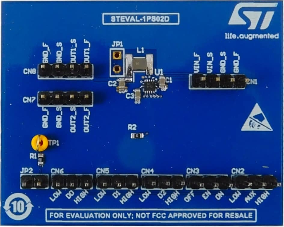 The STEVAL-1PS02D evaluation board allows evaluation of a smart converter able to deliver up to 400 mA output current from a 1.8 to 5.5 V input, with a dynamically adjustable 1.0 to 1.35 V output voltage.