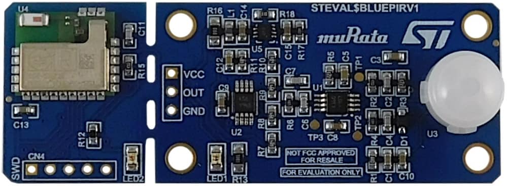 STEVAL-BLUEPIRV1评估板采用了Murata的IRA-S210ST01。IML-0688 Fresnel透镜的检测范围可达5 m。