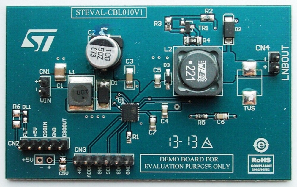 This product evaluation board implements a DC-DC converter based on the LNBH25 device used to power LNBs inside dish antennas which receive satellite TV signals. The LNBH25 is an integrated solution for supplying/interfacing satellite LNB modules in accordance with international standards, offering a complete solution for single tuner satellite receivers and good performance at low cost using few external components. The LNBH25 evaluation board includes an I2C bus interface and the internal 22 kHz tone generator (factory trimmed) is controlled by the DSQIN pin (TTL compatible), permitting immediate DiSEqC™ data encoding. A fully integrated step-up DC-DC converter allows operation with a single input voltage supply source ranging from 8 V to 16 V.