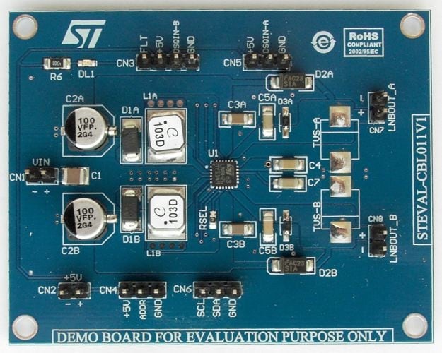 The STEVAL-CBL011V1 demonstration board implements a DC-DC converter based on ST’s LNBH26 device. It is used to power LNBs in dish antennas to receive satellite TV signals.