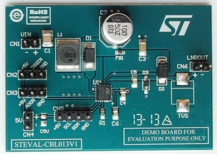 This product evaluation board implements a DC-DC converter based on the LNBH25L device used to power LNB inside dish antennas which receive satellite TV signals. The LNBH25L is an integrated solution for supplying/interfacing satellite LNB modules in accordance with international standards, offering a complete solution for single-tuner satellite receivers and good performance at low cost using few external components. The LNBH25L evaluation board includes an I2C bus interface and the internal 22 kHz tone generator (factory trimmed) is controlled by the DSQIN pin (TTL compatible), permitting immediate DiSEqC™ data encoding. A fully integrated step-up DC-DC converter allows operation with a single input voltage supply source ranging from 8 V to 16 V.