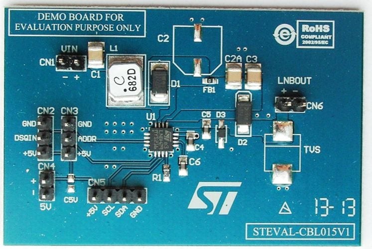 This product evaluation board implements a DC-DC converter based on the LNBH29 device used to power LNB inside dish antennas which receive satellite TV signals. The LNBH29 is an integrated solution for supplying/interfacing satellite LNB modules in accordance with international standards, offering a complete solution for single-tuner satellite receivers and good performance at low cost using few external components. The LNBH29 evaluation board includes an I2C bus interface and the internal 22 kHz tone generator (factory trimmed) is controlled by the DSQIN pin (TTL compatible), permitting immediate DiSEqC™ data encoding. A fully integrated step-up DC-DC converter allows operation with a single input voltage supply source ranging from 8 V to 17.5 V.