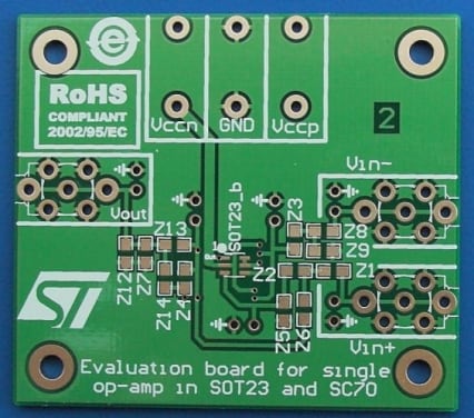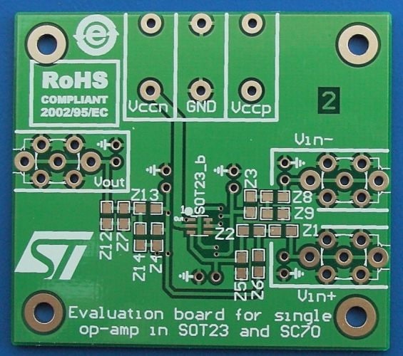 The STEVAL-CCA022V1 demonstration board is designed to help characterize single operational amplifiers in SOT23-5 (two different pinouts) and SC70-5 packages.