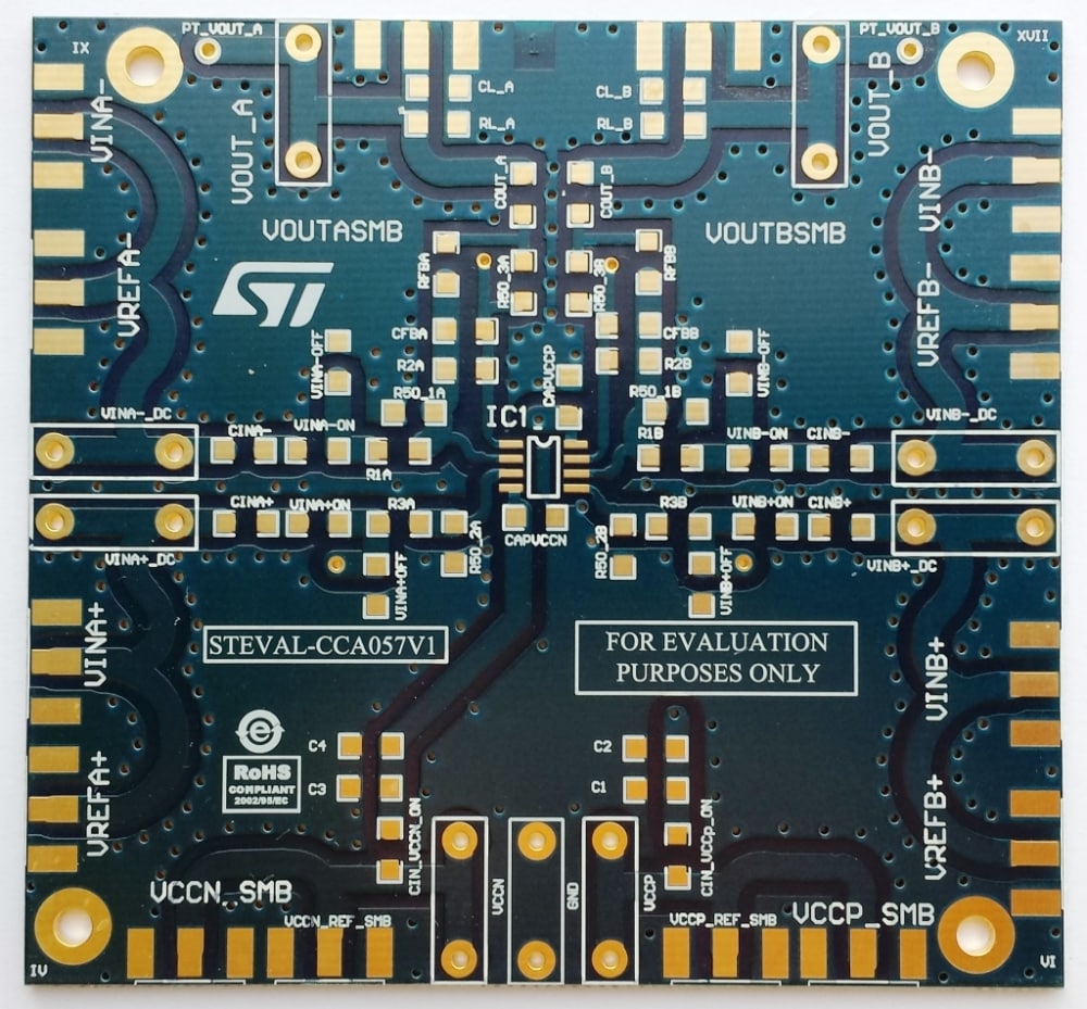 The STEVAL-CCA057V1 evaluation board is designed to help customers quickly prototype new dual op amp circuits in an SO8 package and reduce design time.