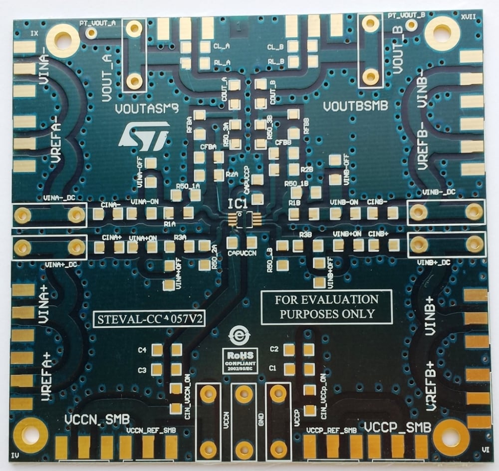 The STEVAL-CCA057V2 evaluation board is designed to help customers quickly prototype new dual op amp circuits in an MSO8 package and reduce design time.