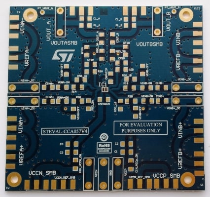 The STEVAL-CCA057V4 evaluation board is designed to help customers quickly prototype new dual op amp circuits in a DFN8-EP package and reduce design time.