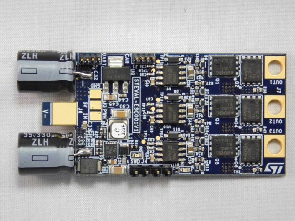 The STEVAL-ESC001V1 reference design for electronic speed controllers (ESC) for drones fits entry-level commercial drone designs and drives any three-phase brushless (or PMSM) motor running off 6S LiPo battery packs, or any equivalent DC supply, up to 30 A peak current.