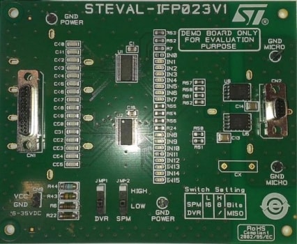 The STEVAL-IFP023V1 product evaluation board allows designers to evaluate the performance of the CLT01-38S4 high-speed protected digital termination array in industrial environmental conditions. The board includes two CLT01-38S4 chips connected to an SPI bus in a daisy chain configuration. It offers a 16-bit digital input interface and indicates each sensor logic state with an LED.