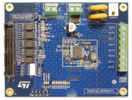 The STEVAL-IFP032V1 evaluation board, based on the VNI8200XP-32 high-side driver, is intended for device testing in terms of power management and digital interface.