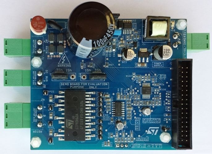 The STEVAL-IHM045V1 system evaluation board is a 3-phase inverter designed to perform field oriented control (FOC) of sinusoidal-shaped back-EMF PMSMs with or without sensors, with nominal power up to 100 W. This flexible, high-performance design consists of a 3-phase inverter bridge based on the STGIPN3H60A SLLIMM™-nano (small low-loss intelligent molded module) IPM, 3-phase inverter, 3 A / 600 V very fast IGBT and the VIPer06 fixed frequency offline converter from the VIPer™ plus family.