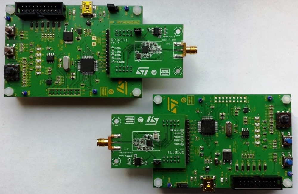 - 2 SPIRIT1 low power, sub-GHz RF transceiver daughterboards tuned for the 433 MHz band