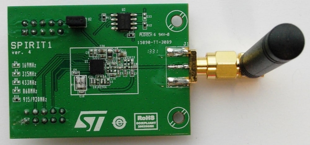- SPIRIT1低功耗sub GHz收发器集成于独立射频模块中,调谐频率为915 MHz