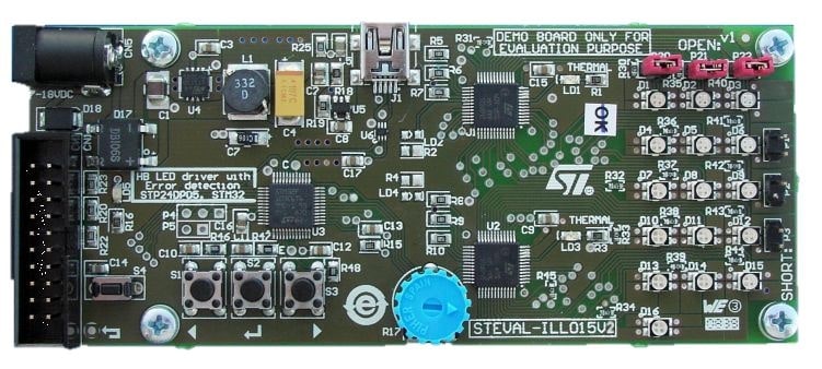 The STEVAL-ILL015V2 product evaluation board provides a platform to test and evaluate the power logic LED driver LED2472G from STMicroelectronics.