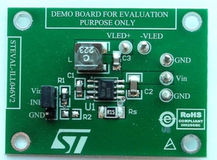 The STEVAL-ILL046V2 evaluation board is based on the ST1CC40, which is an 850 kHz fixed switching frequency monolithic step-down DC-DC converter designed to operate as a precise constant current source with an adjustable current capability of up to 3 A DC.