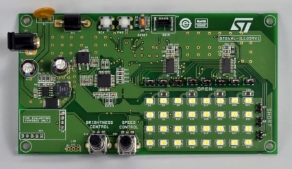 The STEVAL-ILL059V1 evaluation board is a high brightness LED array driver application with diagnostics based on the automotive grade, low voltage, 16-bit constant current LED sink driver STAP16DPS05 from STMicroelectronics.