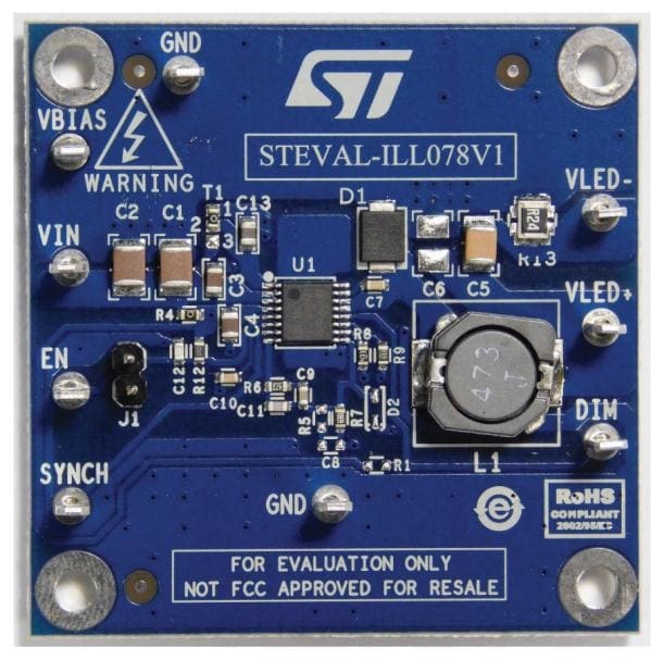 The STEVAL-ILL078V1 product evaluation board is based on the LED6000 monolithic current source for high power LED driving. Digital dimming is implemented by driving the dedicated DIM pin. Low drop-out operation with almost 100% duty cycle can be achieved. The LED6000 is a 61 V asynchronous switching regulator with embedded power MOSFET, designed to source up to 3 A of DC current depending on the application conditions. The 250 mV typical RSENSE voltage drop, the embedded switch-over feature on the VBIAS pin and light load management (pulse skipping) are intended to maximize power conversion efficiency across the entire load range.