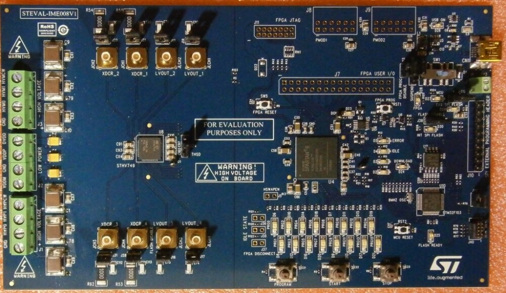 The STEVAL-IME008V1 is a product evaluation board designed around the STHV749 4-channel 7-level high voltage pulser, a state-of-the-art device designed for ultrasound imaging applications.