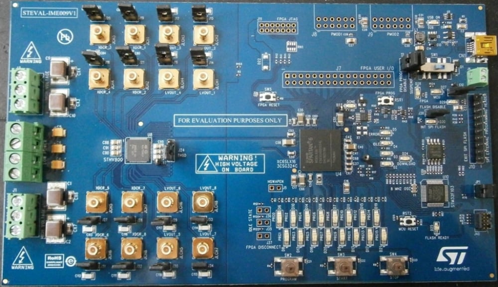 The STEVAL-IME009V1 is a product evaluation board designed around the STHV800 8-channel high voltage pulser, a state-of-the-art device designed for ultrasound imaging applications.