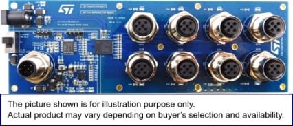 The isolated 8 digital output channels supported by ISO8200AQ and standard M12-A 4 pin female connectors for each channel make the STEVAL-IOL8DOCB a reliable and practical solution for digital output applications. Each connector provides VBUS, output channel pin, and ground pin, supporting both 2-wire or 3-wire high-side actuator.