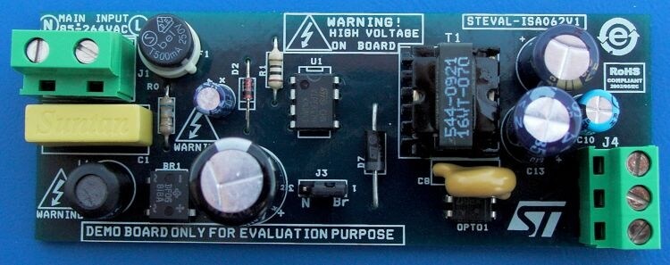 This demonstration board is based on the new VIPer17H device, that is a converter that offers in one package a PWM controller built in BCD6 technology and a 800 V avalanche rugged vertical power section.