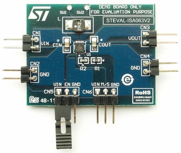 The STEVAL-ISA063V2 demonstration board implements a typical buck-boost DC-DC converter based on STMicroelectronics’ STBB1-APUR high efficiency single inductor dual mode buck-boost DC-DC converter.