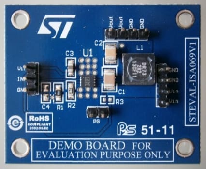 The STEVAL-ISA069V1 demonstration board is based on the ST1S31, which is an internally compensated 1.5 MHz fixed-frequency PWM synchronous step-down regulator. This device operates from 2.8 V to 5.5 V input, while it regulates an output voltage as low as 0.8 V and up to Vin.
