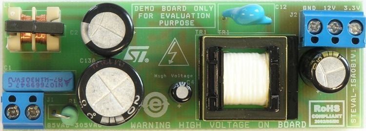 The STEVAL-ISA081V1 demonstration board is a switched mode power supply (SMPS) demonstration board and it is an isolated SMPS capable of delivering a 12 W output over a wide input voltage range.