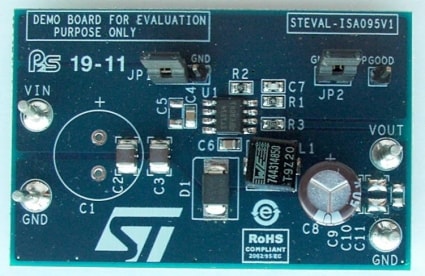 The STEVAL-ISA095V1 demonstration board is designed to provide an evaluation platform for testing the ST1S14, a step-down monolithic power switching regulator capable of delivering up to 3 A of output current. The high current level is possible thanks to an HSOP8 package with exposed frame.