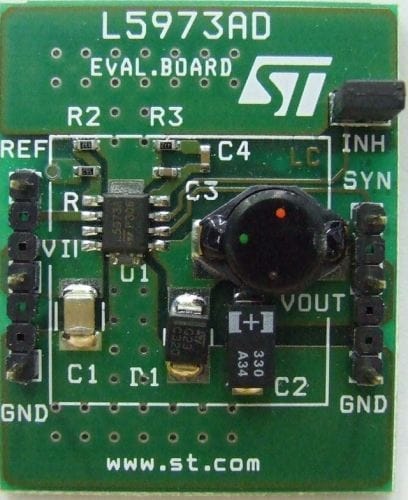 The STEVAL-ISA106V1 demonstration board provides a platform for evaluation of the L5973AD, a step-down monolithic power switching regulator capable of delivering up to 1.5 A of current at output voltages from 1.2 V to 35 V.