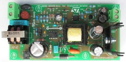 The board uses the new VIPER37LE, an offline high voltage converter from the VIPerPlus family, specifically designed for fixed frequency flyback converters, which combines a high-performance low voltage PWM controller chip and a max. 4.5 Ω RDS(on), 800 V BV(DSS), avalanche-rugged power MOSFET in the same package.