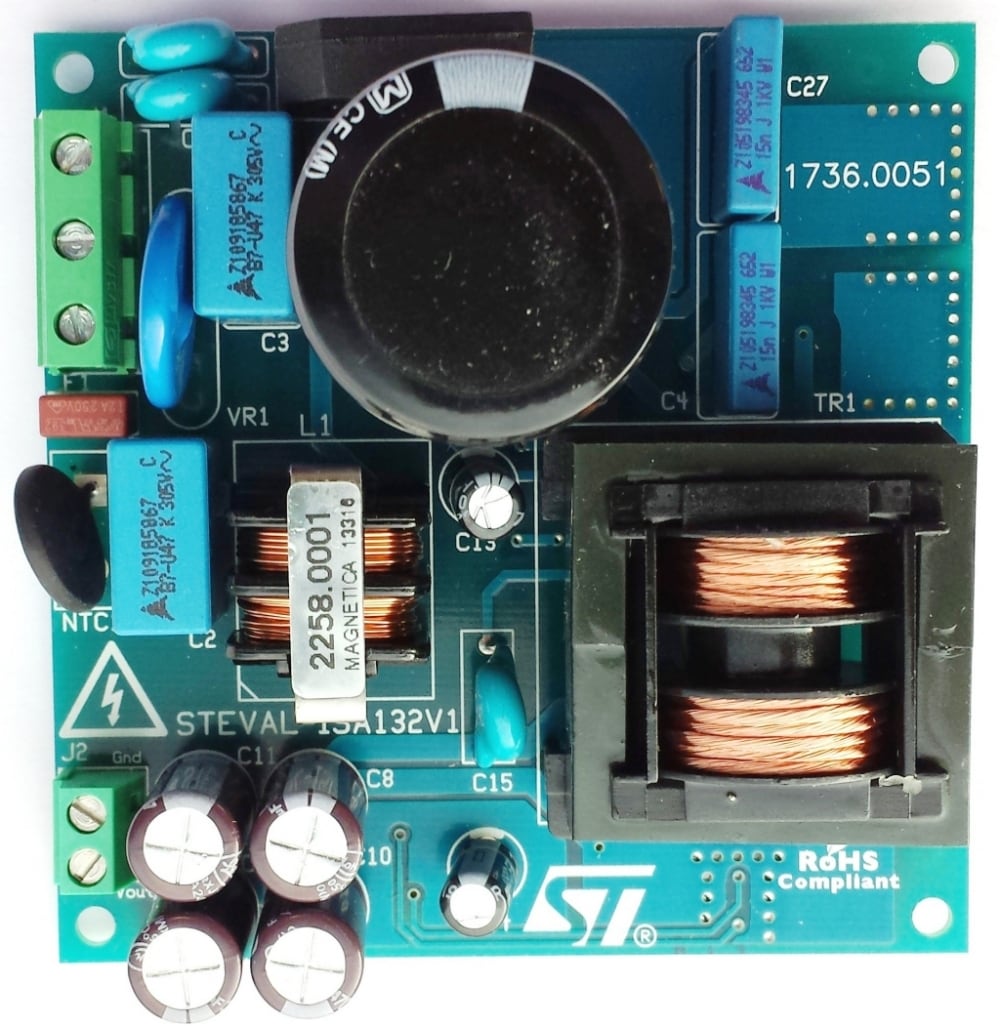 The STEVAL-ISA132V1 evaluation board implements a converter capable of delivering 170 W of continuous power (VIN = 190 VAC to 264 VAC, VOUT = 24 V) and more than 300 W peak power for a limited time. The architecture of the board is based on a single-stage LLC resonant converter without PFC using the new L6699 resonant controller. The L6699 integrates some very innovative functions such as self-adjusting adaptive dead-time, anti-capacitive mode protection and proprietary “safe-start” procedure preventing hard switching at startup. High efficiency at full load (> 92%) and no load (< 0.6 W) is obtained thanks to the STB13N60M2 (600 V, 0.35 W typ., 11 A) MDmesh M2 power MOSFET in the half-bridge, and the STPS20H100CG (VRRM = 100 V, IF(AV) = 2 x 10 A) Schottky diode for secondary rectification.