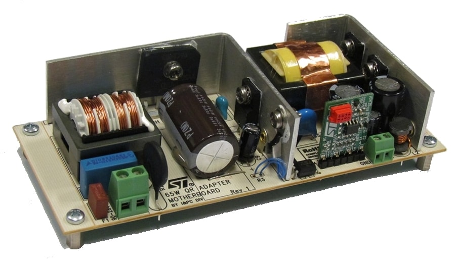 The STEVAL-ISA161V1 is an evaluation board to test the performance of the SEA01 constant voltage and current controller with online digital trimming from STMicroelectronics. The board implements a 65 W adapter, targeting applications such as power supplies for high-end portable computers. The board uses the SEA01 as secondary side CV/CC controller, allowing the application to satisfy very precise output voltage and current regulations thanks to the digital trimming technique employed. The primary side PWM controller is the L6566B. This device drives a TM flyback topology, the best fit for this type of application.