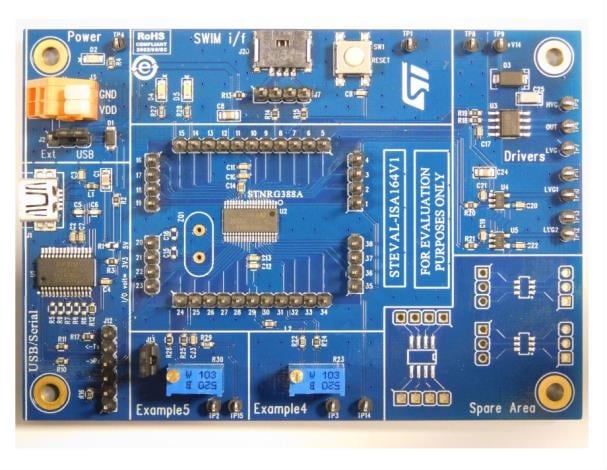 The STEVAL-ISA164V1 evaluation board is designed to help familiarize the user with the STNRG family of digital controllers and their innovative SMED (state machine, event driven) architecture. A convenient GUI enables the user to quickly generate the optimal SMED configuration for the application. The external pins make it easy to inject SMED events and capture the SMED-controlled PWM clock, thereby helping the user to validate the SMED configuration. Alternatively, the application circuit can be driven directly from the evaluation board. The board provides a micro-USB connector to allow programming, GUI connectivity and configuration via a terminal utility running on a PC. STNRG controllers integrate a serial interface which can be used to extend the STNRG388A communication capabilities via Bluetooth, WiFi or powerline modems. The STEVAL-ISA164V1 evaluation board can be powered in three different ways: by external power supply, USB or via the SWIM interface. The board features several free footprint areas which are ideal for connecting power drivers or amplifiers. An additional free PCB footprint allows the user to connect a quartz clock, which can be used in place of the STNRG388A internal clock.