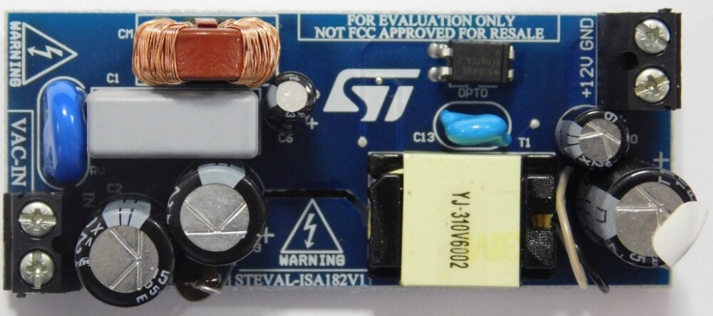 The STEVAL-ISA182V1 evaluation board implements an isolated flyback converter (12 V / 0.7 A) 8.4 W (30 W peak), US range 85 – 132 VAC, developed for metering.
