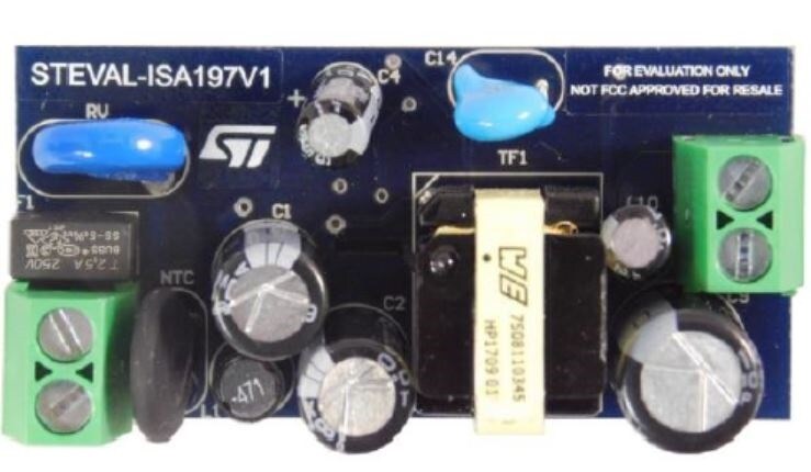 The STEVAL-ISA197V1 evaluation board implements a 7.8 W (12 V / 0.65 A) isolated flyback wide range mains developed for general purpose applications.