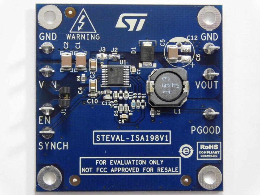 The STEVAL-ISA198V1 product evaluation board is a step-down switching power supply based on the L7987L regulator in an HTSSOP16 package. The output voltage can be set starting from 0.8 V. Low drop-out operation, due to the advanced integrated switch management, can be achieved.