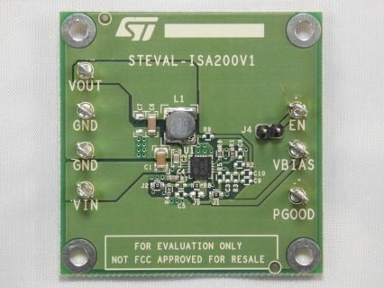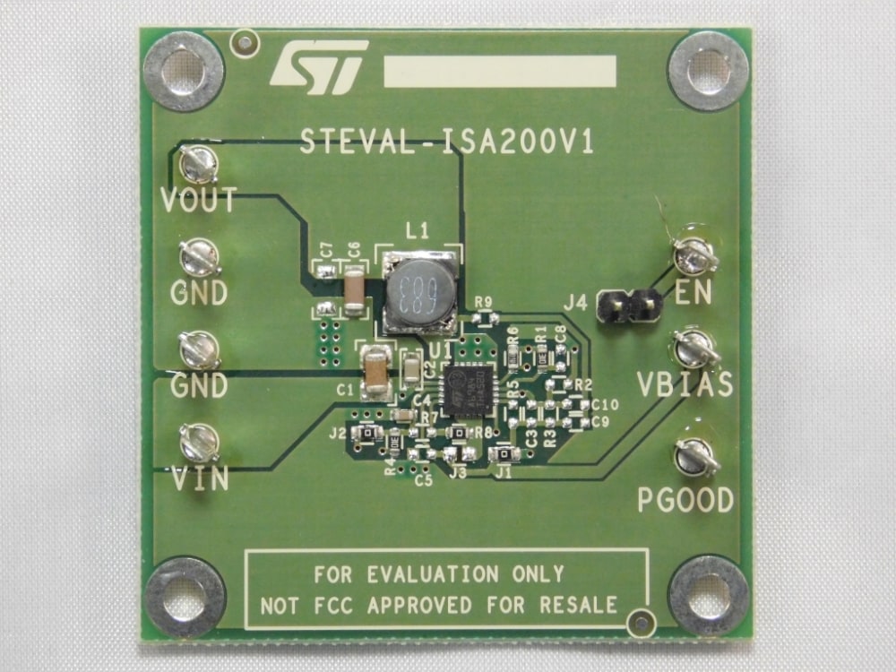 The STEVAL-ISA200V1 product evaluation board is based on the A6984 high-efficiency monolithic synchronous step-down regulator, capable of delivering up to 400 mA of DC current. The fixed 3.3 V output requires no external resistor divider. The A6984 is especially suited for automotive systems. The low consumption mode (LCM) is designed for automotive applications that remain active while the car is parked, maximizing efficiency at light load with controlled output voltage ripple. The low noise mode (LNM) renders the switching frequency nearly constant over the load current range, serving low noise application specifications such as audio and sensors. The PGOOD open collector output can implement output voltage sequencing during the power-up phase. The synchronous rectification, designed for high efficiency at medium-heavy load, and the high switching frequency capability ensure a compact application size. Pulse-by-pulse current sensing on the low-side power element implements effective constant current protection.