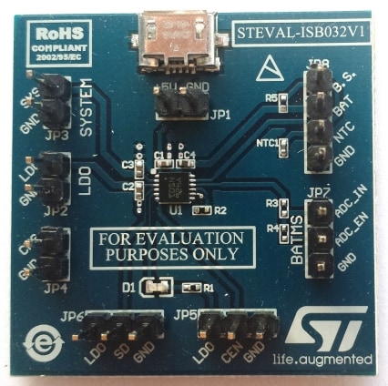 The STEVAL-ISB032V1 is a product evaluation board based on the STNS01, which is a linear charger for single-cell Li-Ion batteries integrating an LDO regulator and several battery protection functions. The device uses a CC/CV algorithm to charge the battery. The fast-charge current can be programmed using an external resistor. Pre-charge current and termination current are scaled accordingly. The floating voltage value is 4.2 V. The input supply voltage is normally used to charge the battery and provide power to the LDO regulator. When a valid input voltage is not present and the battery is not empty, the device automatically switches to battery power.