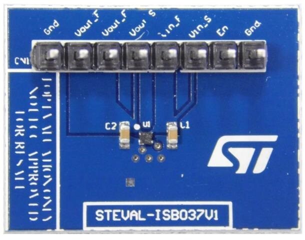 The STEVAL-ISB037V1 board features the LD39020 high performance linear voltage regulator, configured to convert a DC input voltage from 2.4 V to 5.5 V into a precise and stable 1.8 V output voltage.