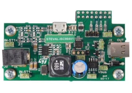 The STEVAL-ISC004V1 evaluation board is a ready-to-use USB PD source based on STUSB4710A and ST1S14 ICs. It demonstrates how to convert a fixed voltage DC power input into a USB PD variable voltage output.