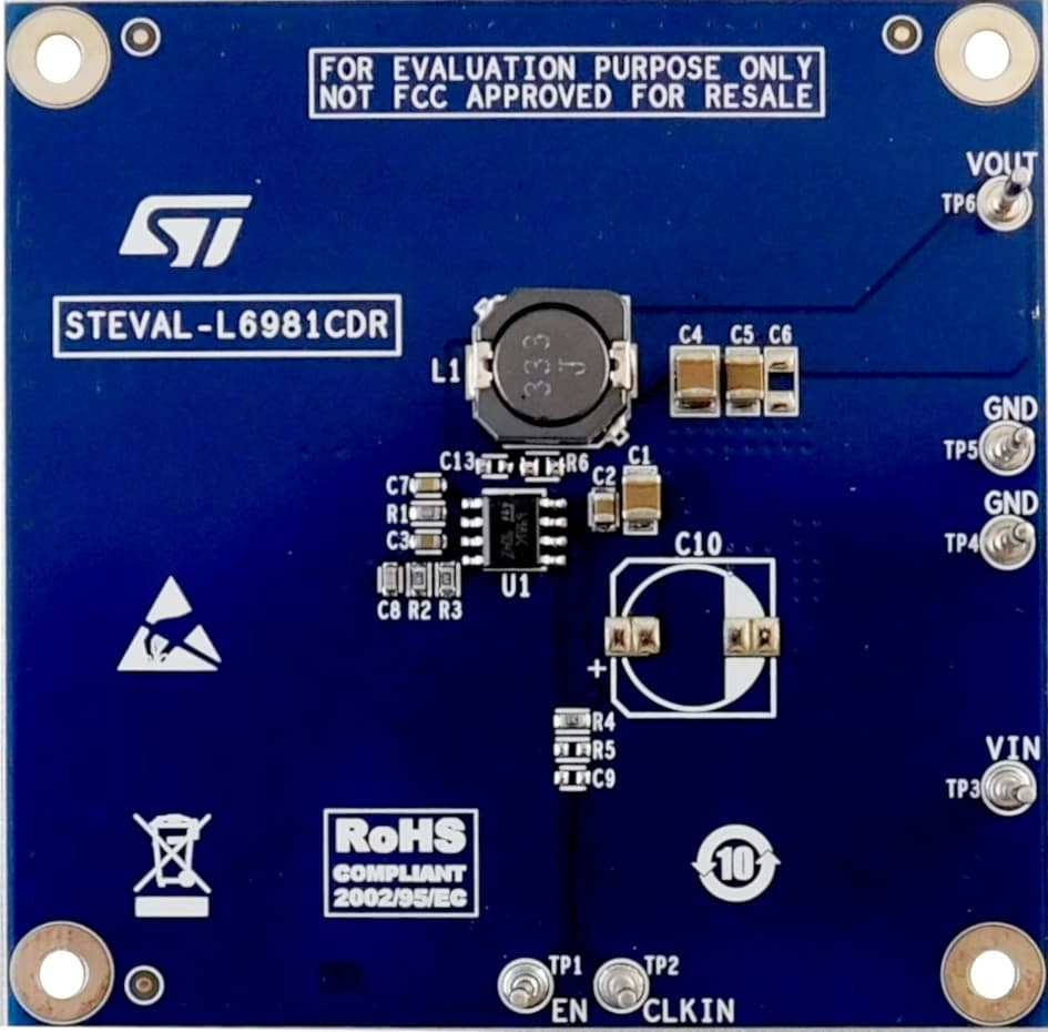 The STEVAL-L6981CDR evaluation board is based on the L6981CDRsynchronous monolithic step-down regulator capable of delivering up to 1.5 A DC.