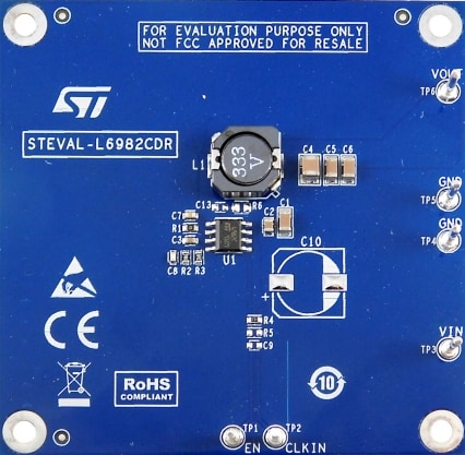 The STEVAL-L6982CDR evaluation board is based on the L6982CDR synchronous monolithic step-down regulator capable of delivering up to 2 A DC to the load.