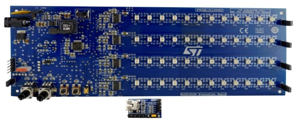 The STEVAL-LLL002M1 is a LED array driver system evaluation board with local dimming and diagnostics for automotive applications. It is based on the ALED1262ZT 12-channel LED driver controlled through the STM8AF6266 microcontroller I²C interface.