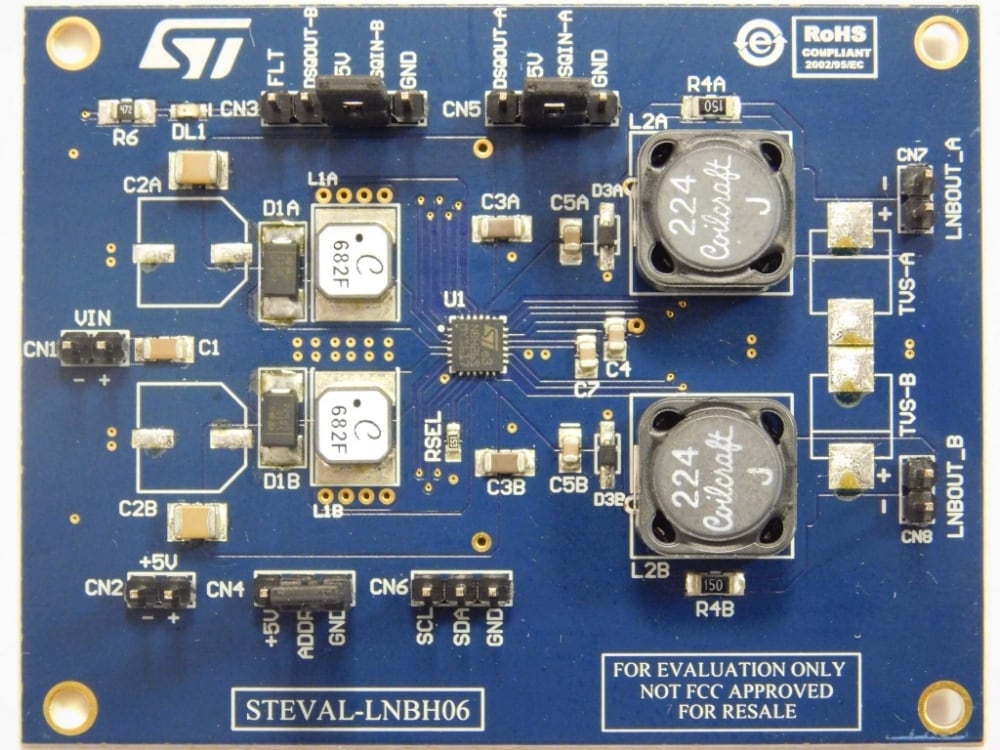 The LNBH26S evaluation board includes an I²C bus interface and the internal 22 kHz tone generator which is factory trimmed and can be controlled by the DSQIN pin (TTL compatible), which allows immediate DiSEqC™ data encoding. Thanks to a fully integrated step-up DC-DC converter, it functions with a single input voltage supply source ranging from 8 V to 16 V.