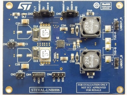 This evaluation board implements a DC-DC converter based on the LNBH26S device. It is used to power LNBs inside dish antennas to receive satellite TV signals.