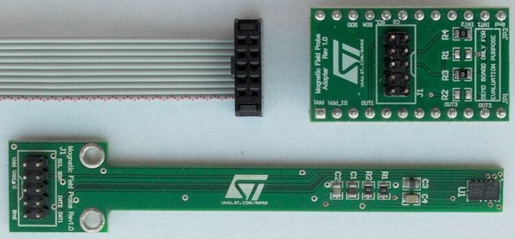 The device is mounted on the top of a very thin probe, due to its small package size. The probe can be easily used to measure magnetic field intensity, i.e. for finding the source of magnetic field disturbances on a PCB.